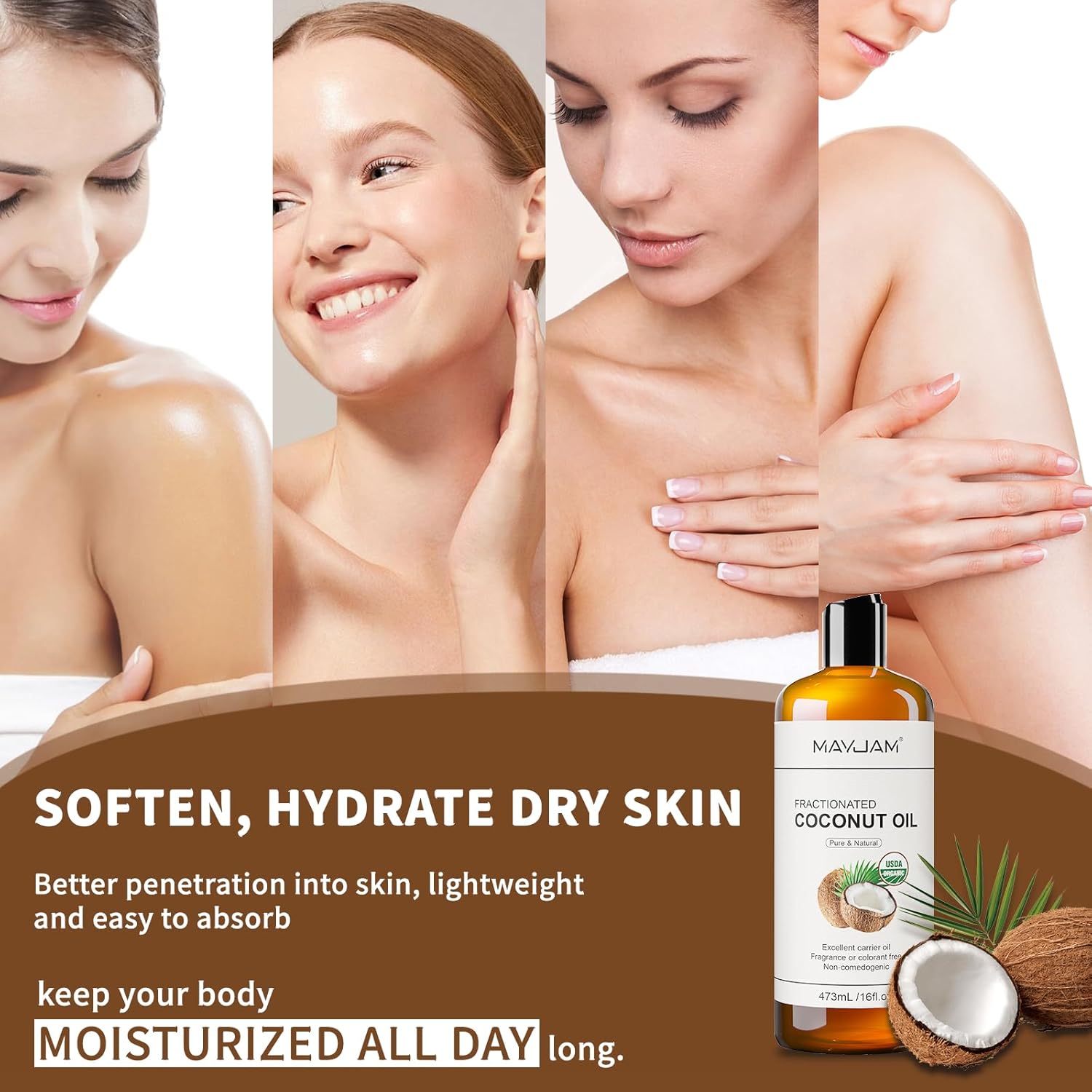- Organic Fractionated Coconut Oil For Essential Oils: Our coconut massage oil is one of the most versatile oils on the market. Its an ideal carrier oil for diluting essential oils, its hydrating and has a very mild scent. This organic virgin coconut oil is easily blends with any essential oil while keeping its natural scent and benefits, such as diluting MAYJAM essential oils, like Lavender, Vanilla, Tea Tree, or Sandalwood oil ect., helping your skin absorb them smoothly, without irritation or dryness