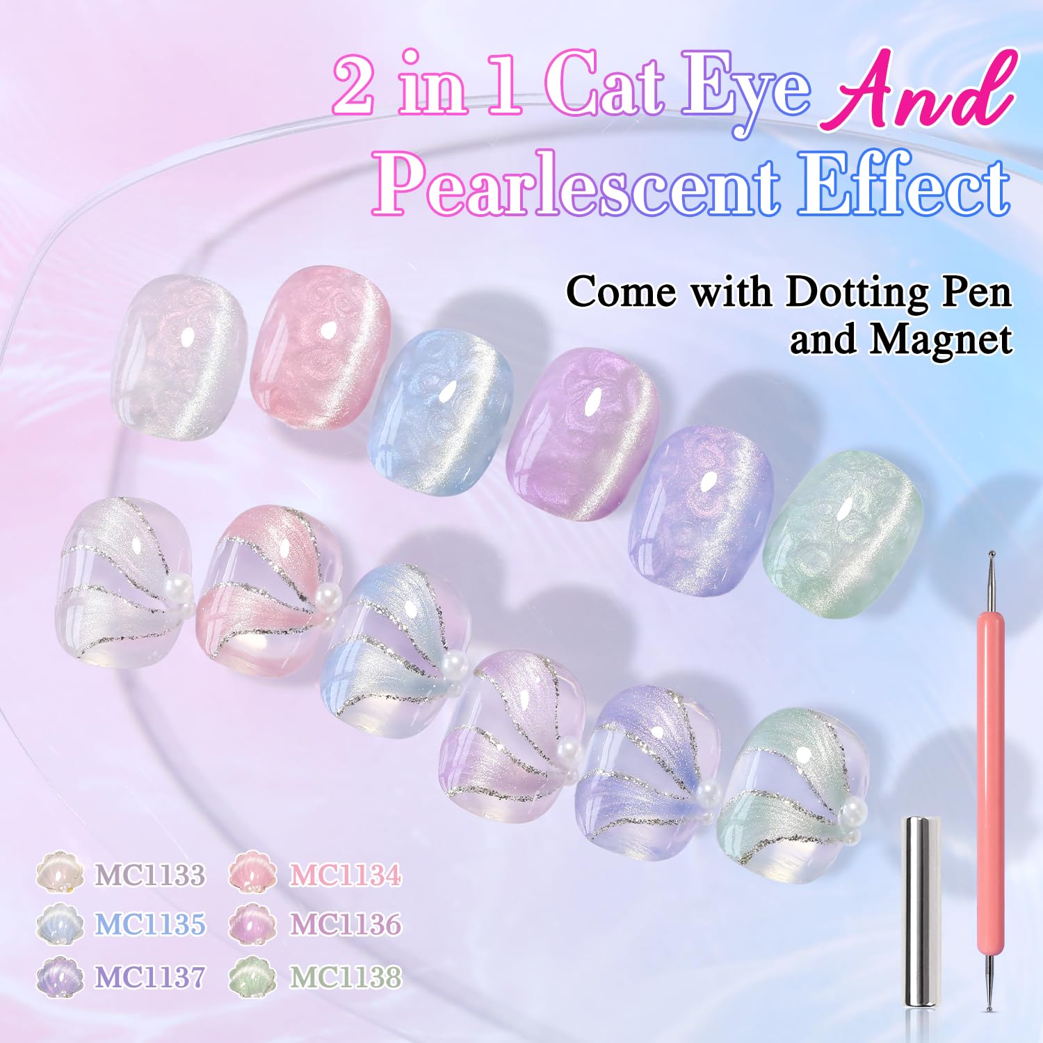 Double Rhythm Cat Eye Gel Nail Polish Set of 6 Same Color Same Bottle 0.5 Oz Shimmer Glitter with Magnet Holographic Reflective Magnetic UV Nail Polish Kit (Pearl Pink Blue Green Purple-T6-36)