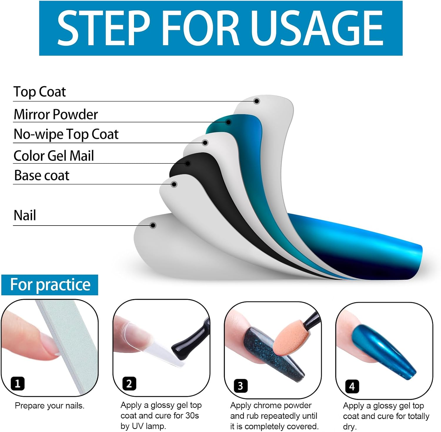 - The Scope Of Application:All chrome powders should only be applied to glossy No wipe top coat to embellish Nail-Polishes color. Otherwise it is unusable, it can't be applied directly to the nail, and it can't be applied directly to the skin. Artdone chrome powder can be applied on UV gel nails, acrylic nails or false nail tips. You can use them very easily