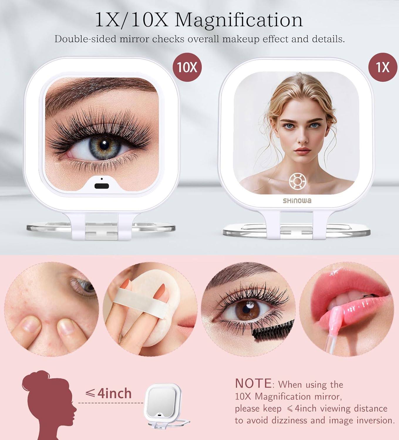 - 10X/1X Magnification Mirror: This travel makeup mirror features a double-sided design with 1X and 10X magnification. The 1X side is suitable for overall makeup and daily skincare. The 10X side zooms out your makeup details when applying eyeliner, mascara, or grooming eyebrows for a flawless and delicate makeup look. NOTE: When using the 10x magnifying mirror, please keep the mirror ≤ 4 inches or closer to your face.