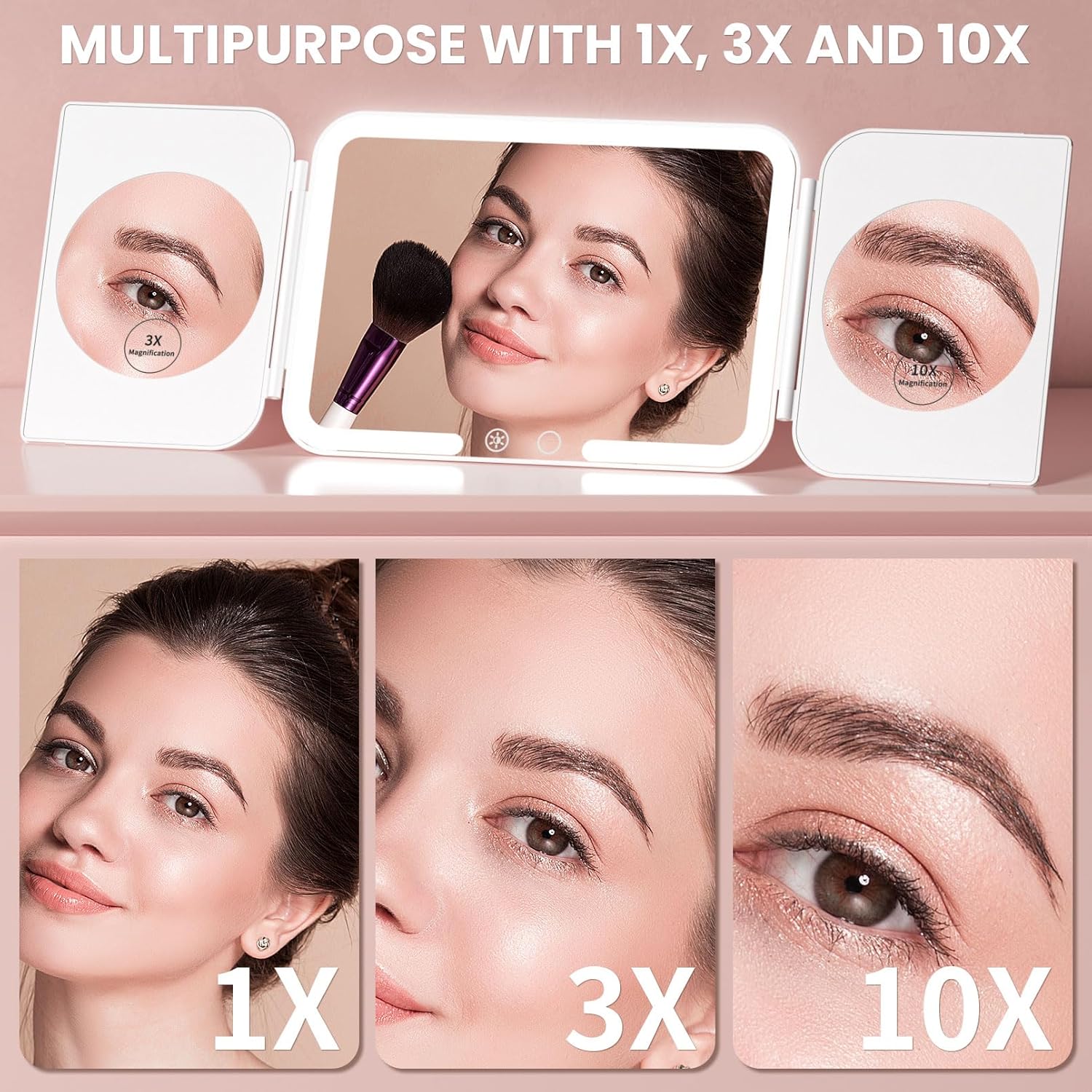 Trifold Travel Lighted Makeup Mirror, 5000mAh Rechargeable Light Up Magnifying Mirrors 1X/3X/10X, 3 Color Lighting&Stepless Dimming, Ultra Bright and Multi-Angle Adjustment