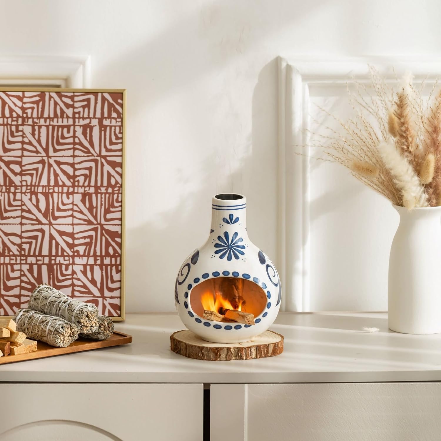 Handmade Ceramic Palo Santo Holder Burner & Sage Holder - Mini Tabletop Chiminea Burner Tray with Ash Catcher, Decorative Incense Holder for Spiritual Meditation & Yoga