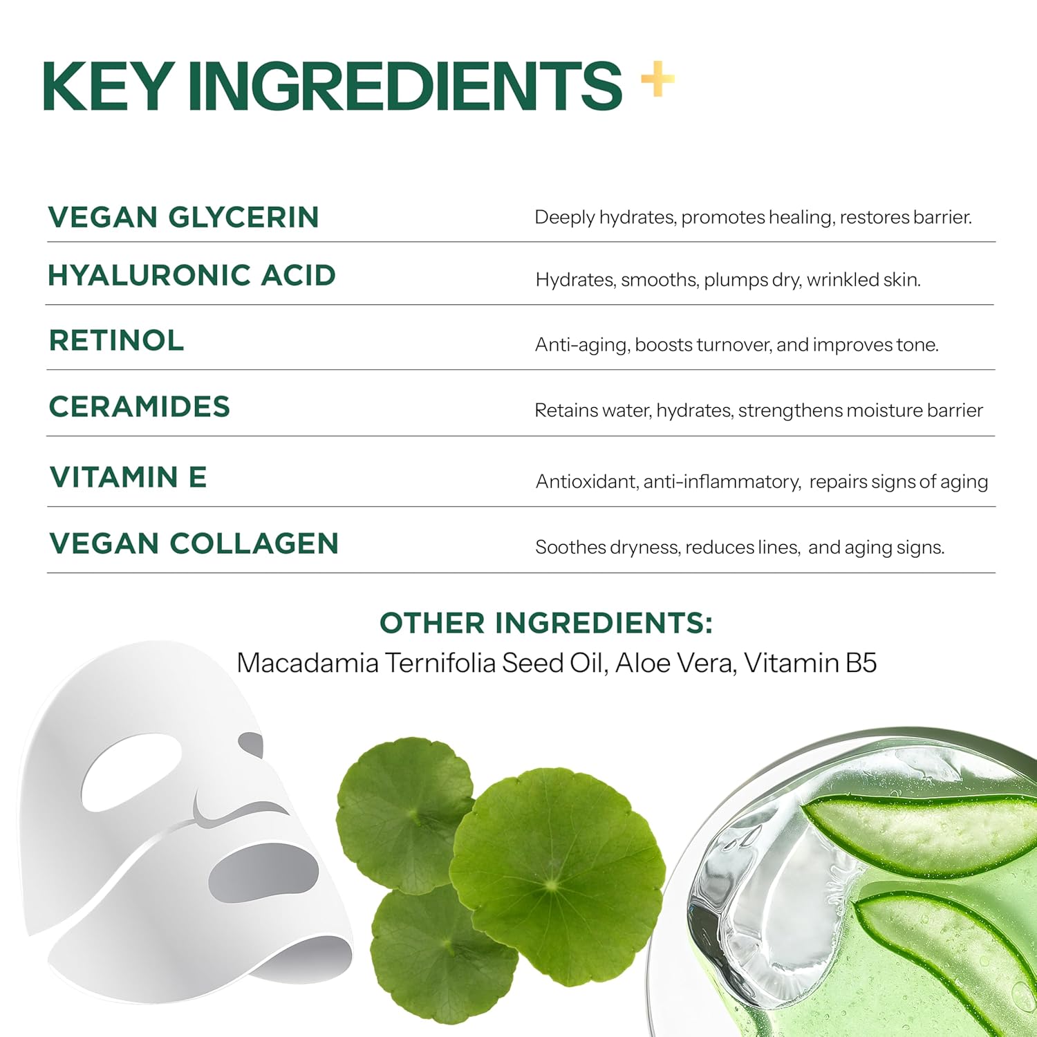 Face Mask with Retinol and Collagen - Dermatologist Tested, Anti Aging - Firming & Barrier Protecting - 3-in-1: Detox - Treat- Boost - Clean Beauty, Korean Skin Care, 5 Sheet Masks