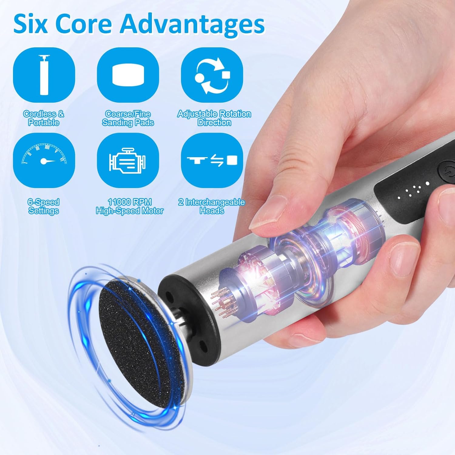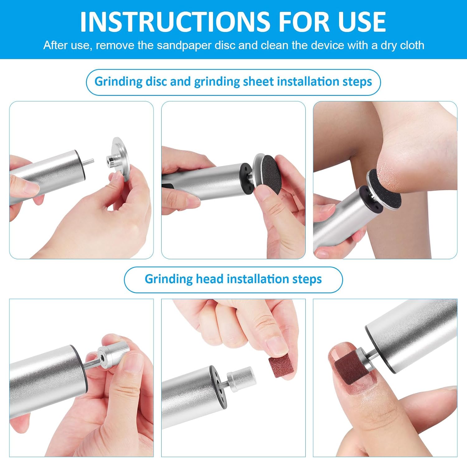 - 【Package Includes】: 5.9-inch device × 1,USB charging cable × 1,Premium metal heads × 2 (Callus mode / Nail mode),80 grit for calluses ×10,120 grit for sensitive areas ×10,Ring sandpaper for nail polishing × 10,User manual × 1