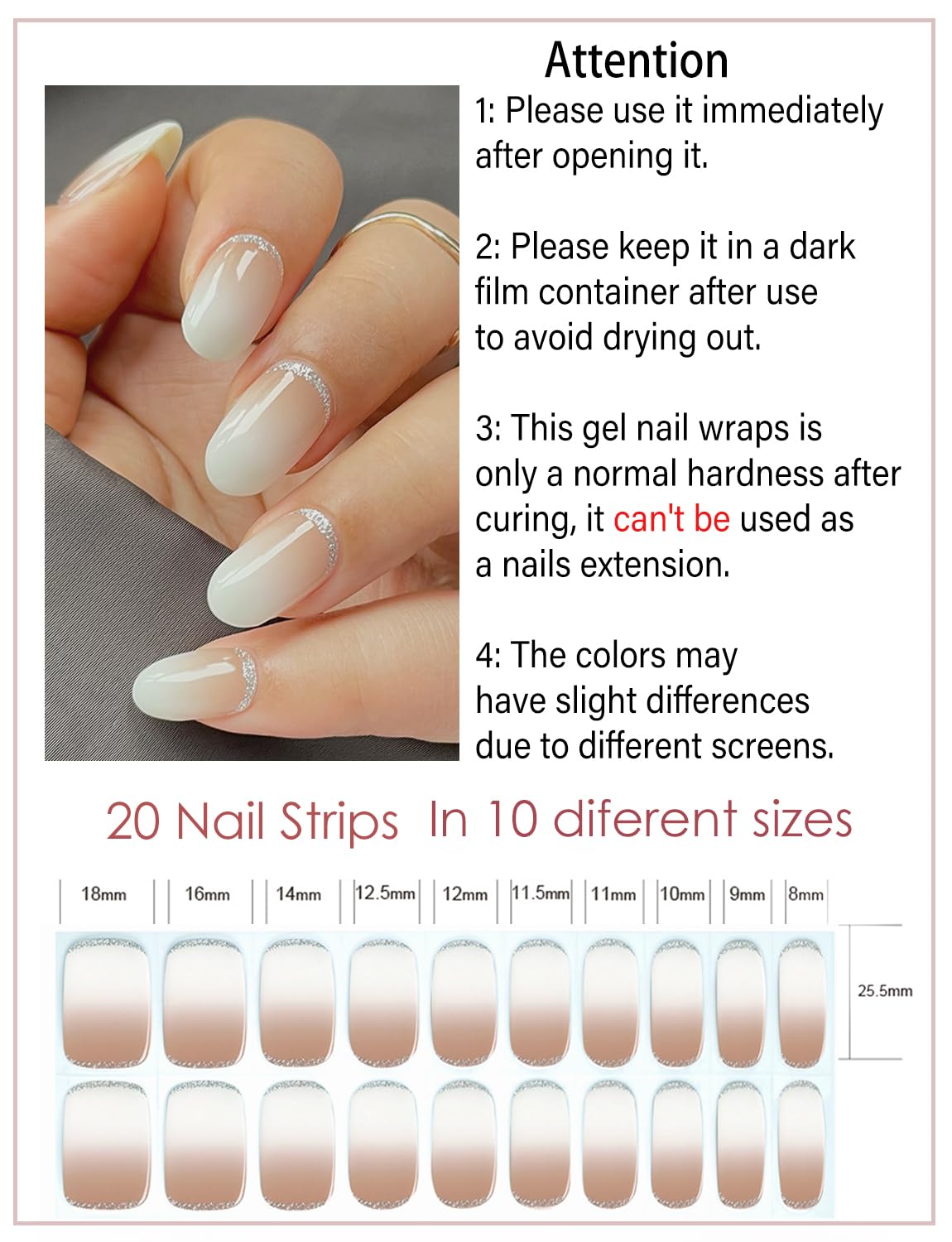 - Semi Cured Gel Nail Strips: New style semi cured gel nail wraps are made from real gel nail polish ingredients, not plastic material. Help you get rid of long-time manicures and nails damage.