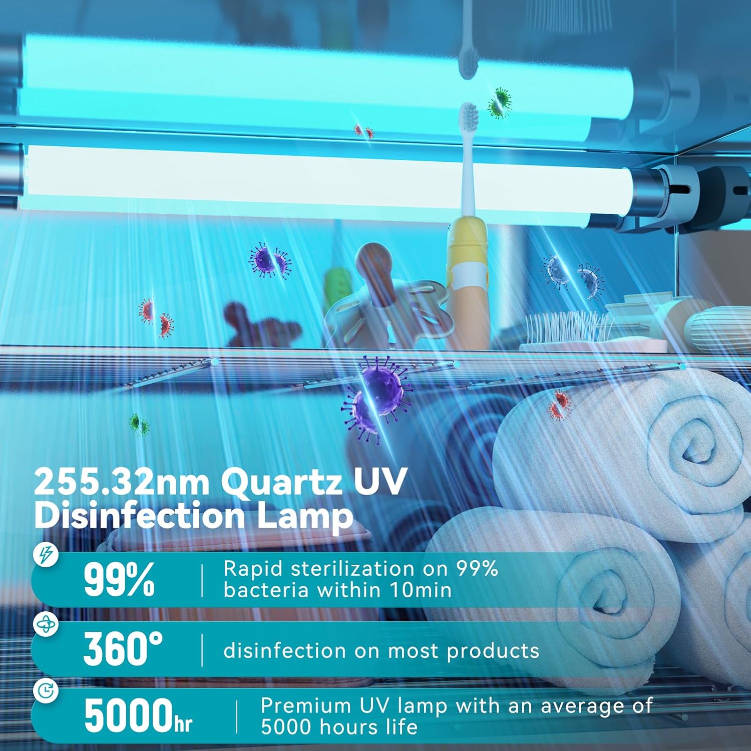 - Advanced U&V Care Technology: The U&V oven utilizes U&V light technology (not heat) for a thorough item refreshment process. Therefore it is safe for all items.The specially designed door effectively contains the U&V light within the cabinet during operation. In addition, when the door is opened, the U&V light will automatically extinguish, do not have to worry about the radiation effect on the body.