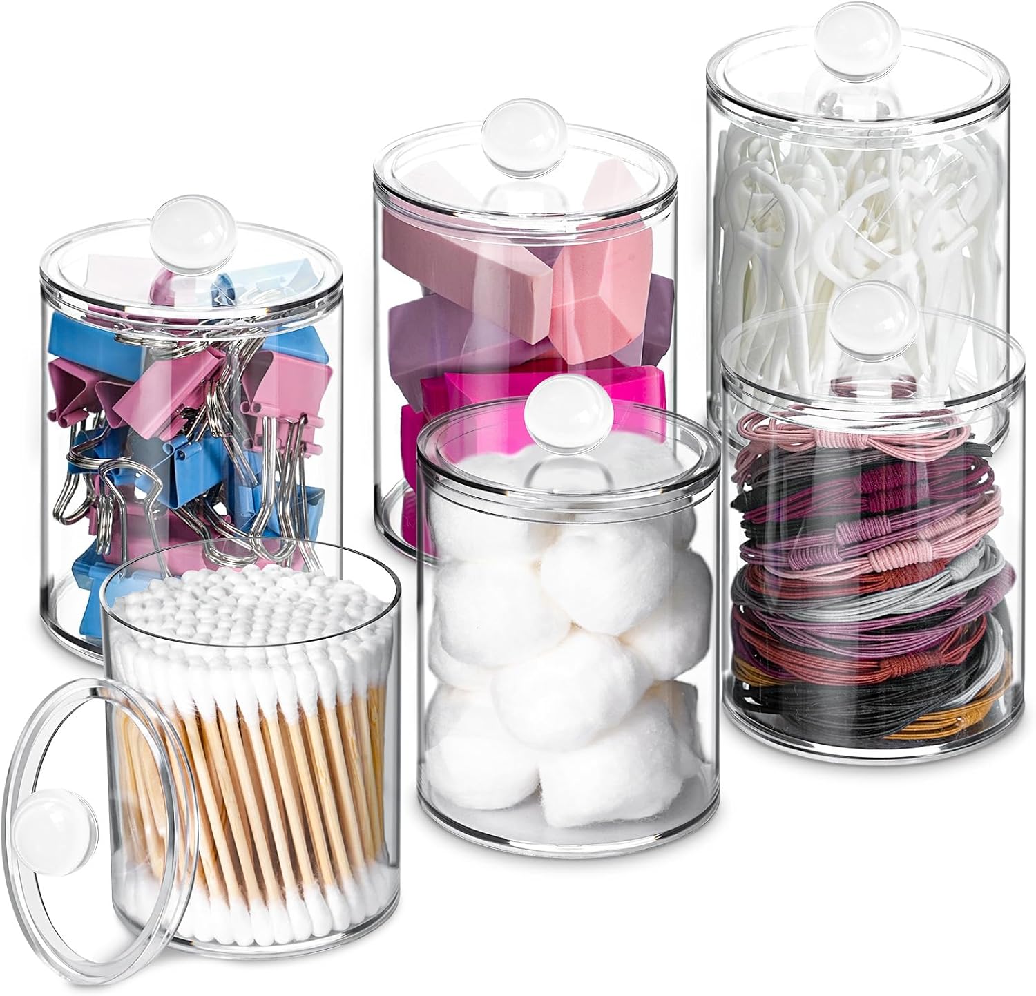 6 Pack Qtip Holder,Canister Apothecary Jar Set, Bathroom Jars with Lids Set for Cotton Swabs, Balls, Pads, Floss Picks,10oz-12oz Plastic Canisters Restroom Bedroom Vanity Organizer(Clear)