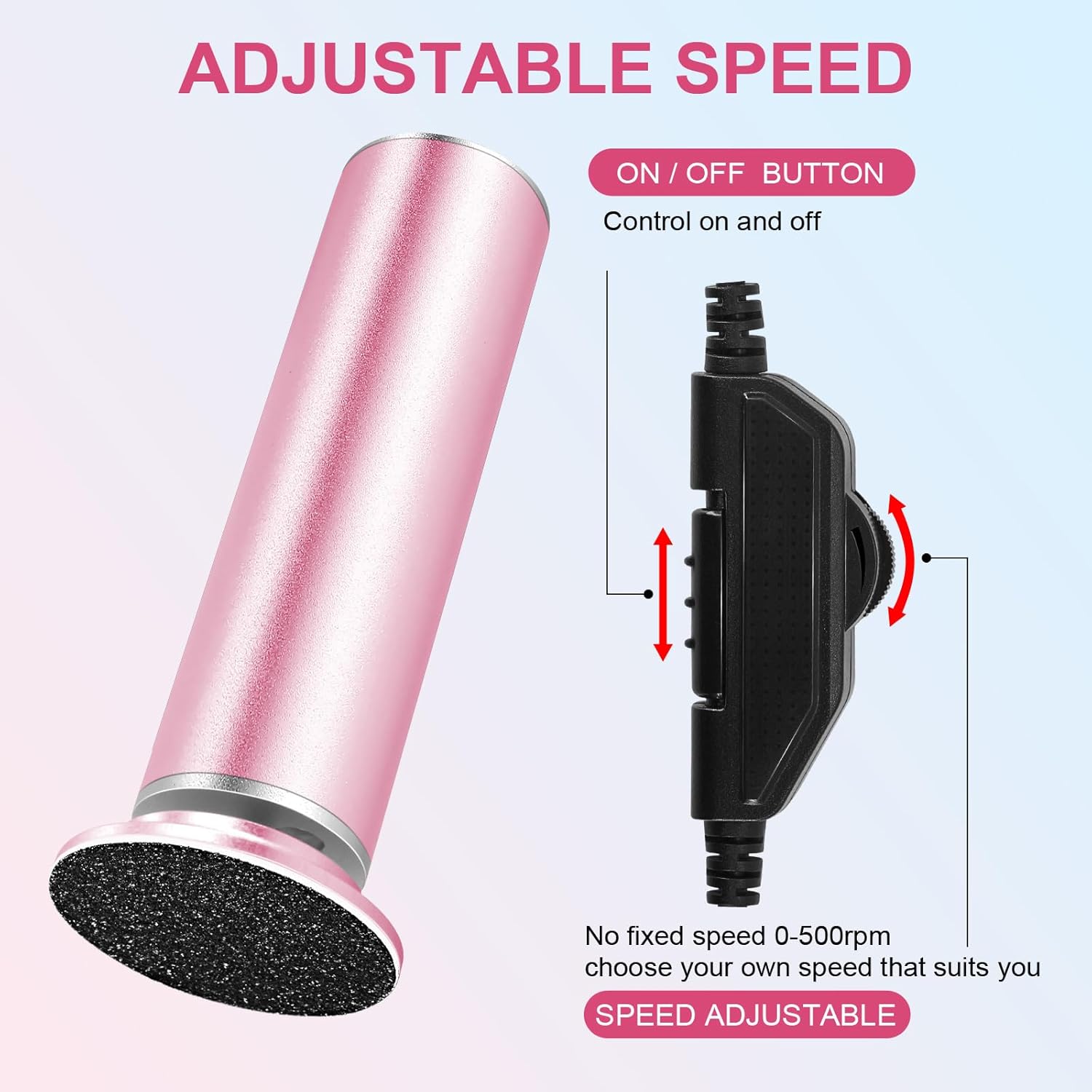 - ADJUSTABLE SPEED: Are you still using traditional electric feet callus remover with only 3 or 2 speeds? Our electric foot file sander has unlimited speeds, and you can adjust the speed within the speed range (0-500rpm) to suit yourself, removing dead skin from the heel more gently and smoothly.