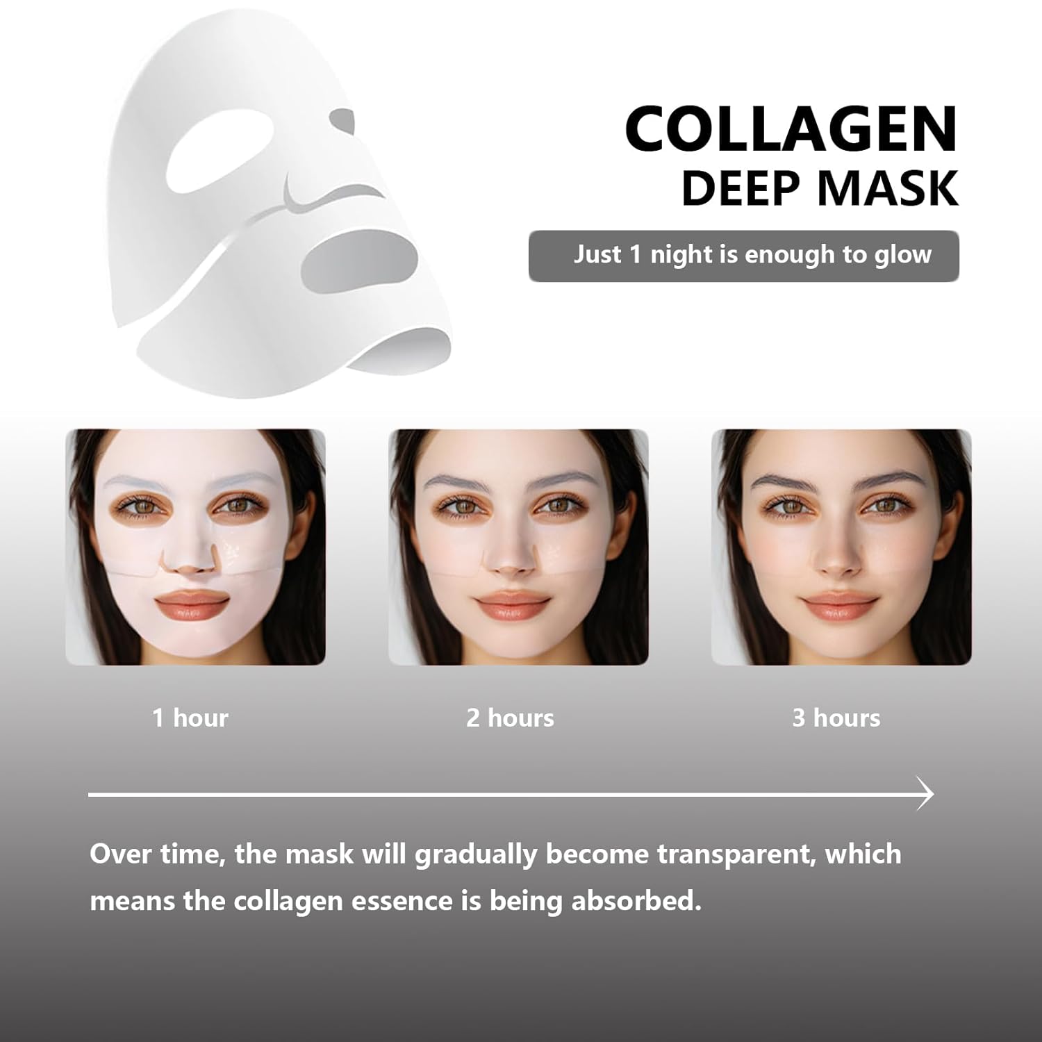 - Translucent Transformation: Experience the innovative capabilities of our low molecular weight collagen mask, which transforms from white to transparent after 3-4 hours, indicating complete absorption and maximum effectiveness of the active ingredients, a unique indicator of effective skin care.