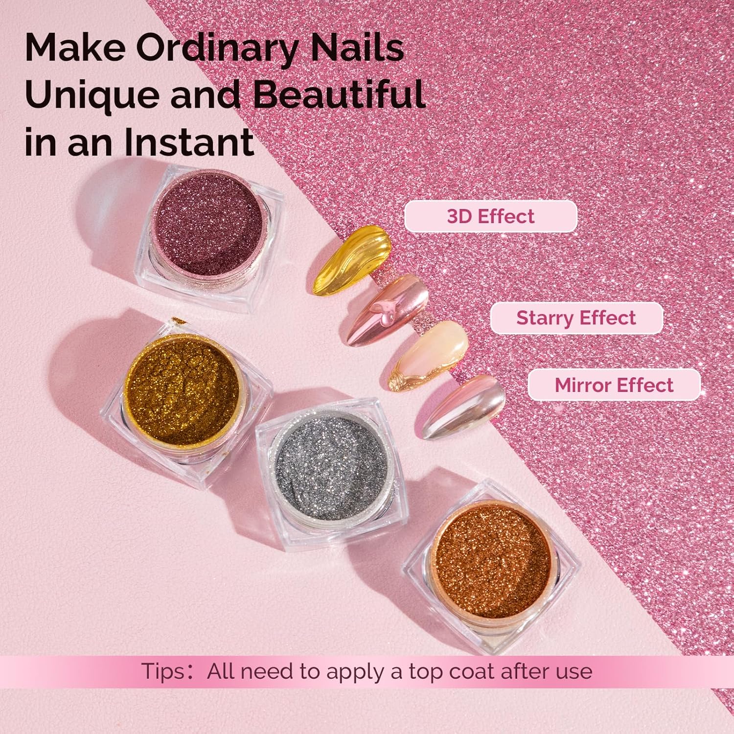 - Wide Range of Applications: Suitable for UV gel nails,acrylic nails,natural nails or false nails.Easy to get a salon grade chrome effect without special techniques.Powder is easy to apply and suitable for beginners