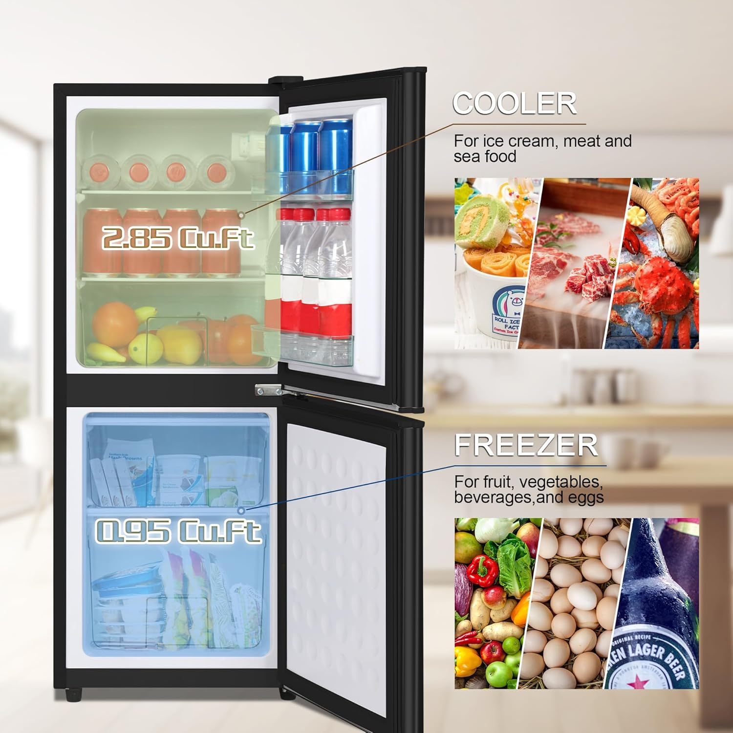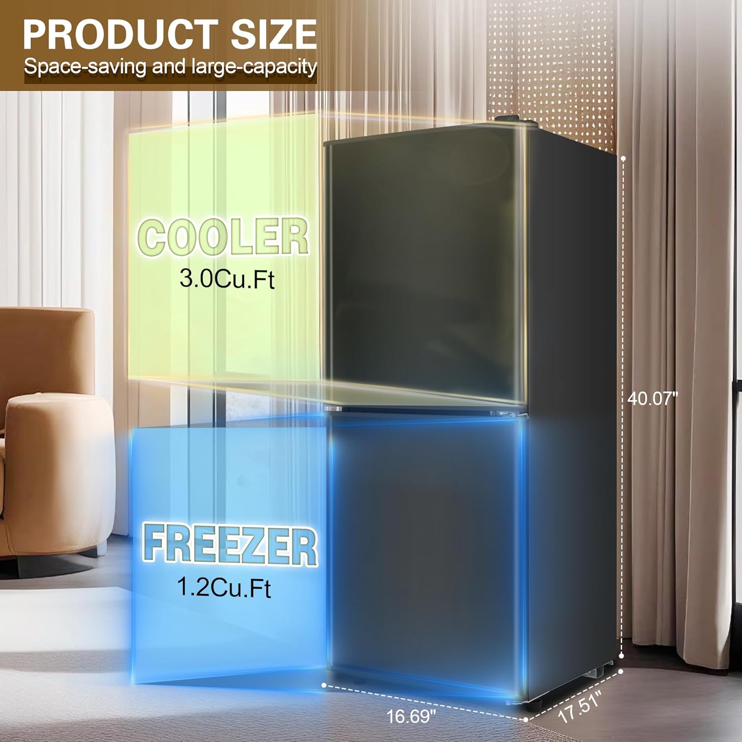 - 🧊【2-Door Fridge and Freezer】Enjoy the convenience of a 2-door small refrigerator with freezer, offering a spacious 3.0 Cu. Ft. refrigeration compartment and a separate 1.2 Cu. Ft. freezer compartment. This allows you to easily store and organize a variety of food and drinks, ensuring that everything has its designated space. From fresh produce to frozen treats, our mini fridge provides the perfect solution for all your storage needs with the 7-level thermostat control.