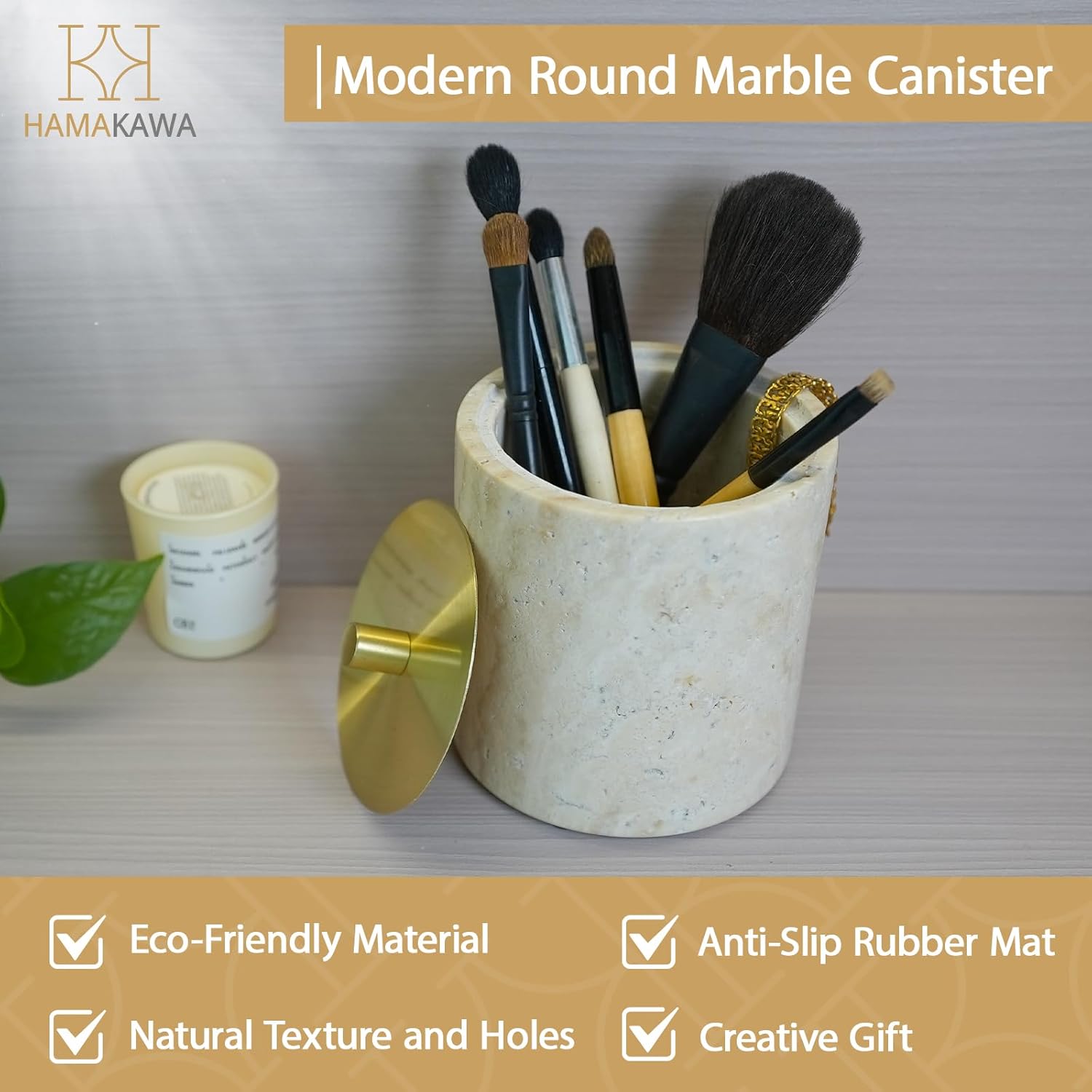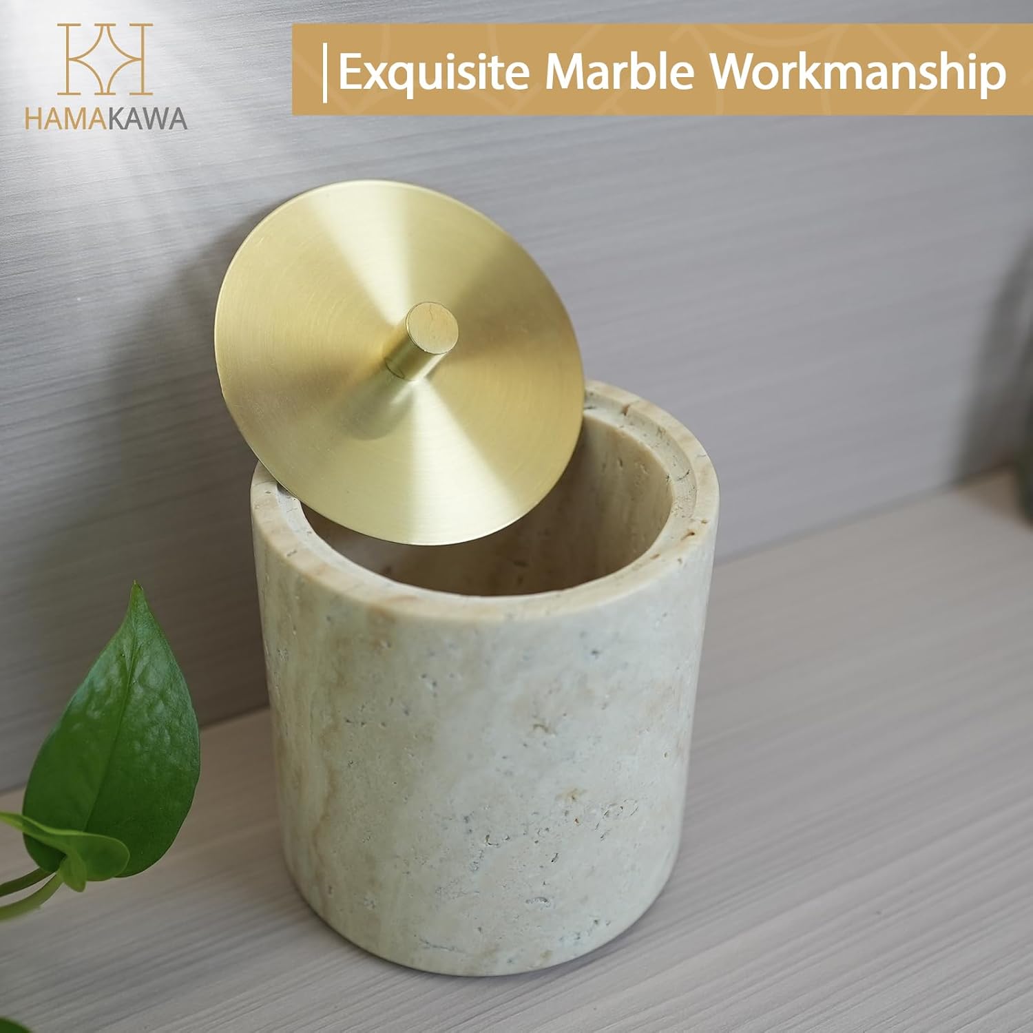 Qtip Holder With Brass Lib, Beige Travertine Cotton Swab Jars 4 Inch, Modern Round Marble Canister, Small Apothecary Storage Jars for Bathroom, Bedroom, Vanity, Kitchen Cabinet