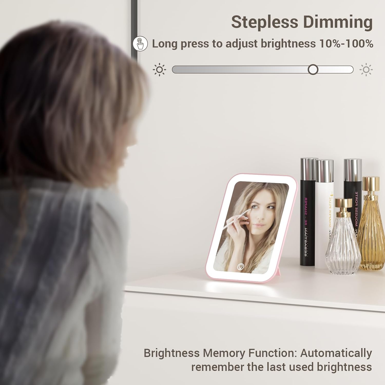 Kintion Travel Makeup Mirror, 6"*4.2" Rechargeable Portable LED Lighted Tabletop Vanity Mirror, 3 Colors Touch Dimmable Compact Mirror for Women Gift, Pink