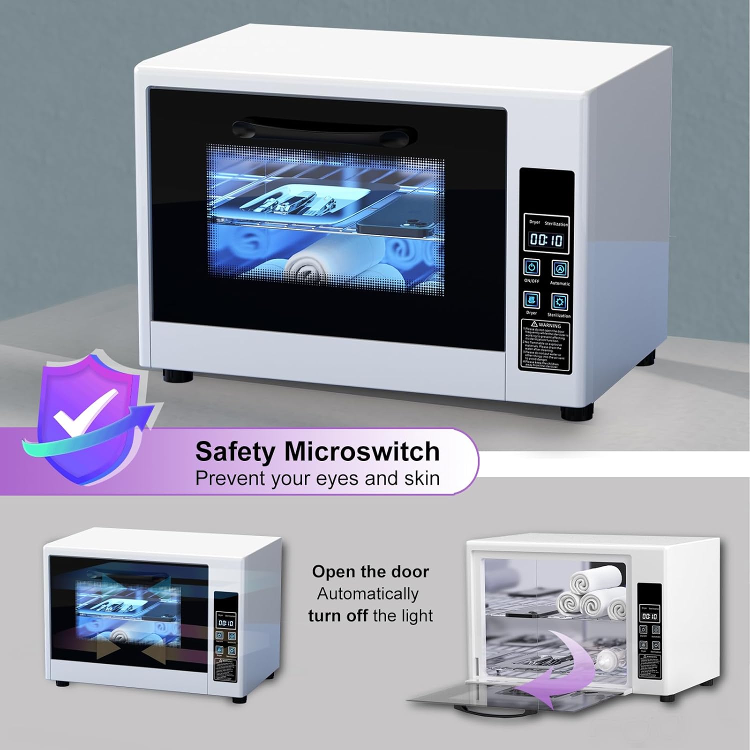 - Powerful & Hot Air Cleaning: This cleaning cabinet uses light and hot air to remove harmful substances and purify the air. light penetrates deep into tools, the stainless steel interior effectively accomplishes 360° cleaning of items, while hot air dries them quickly. The result? Clean, dry tools ready for use, providing a reliable hygiene solution for every professional
