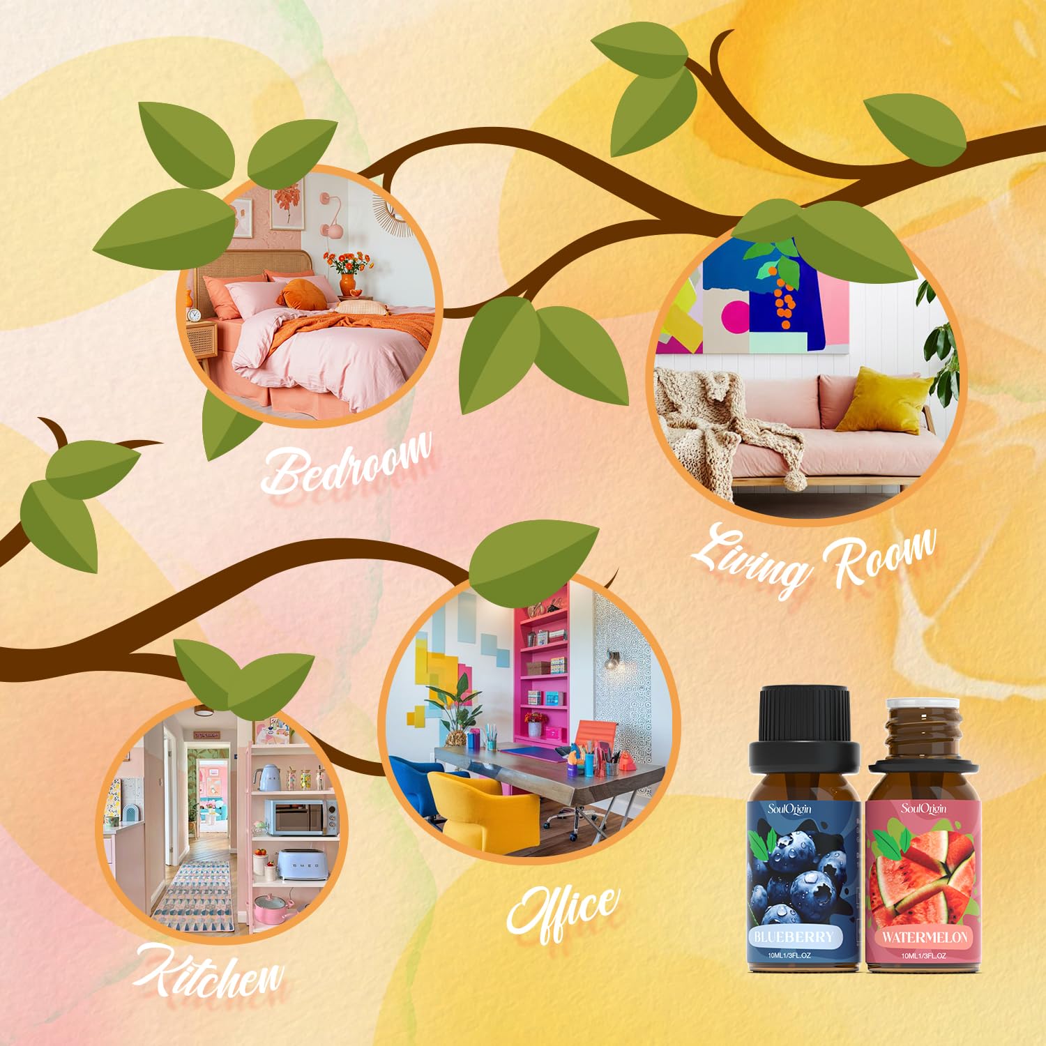 - Juicy Medley of Fresh Fruit Scents: Indulge in a fruity escape with our delightful collection of Fruit Essential Oils, featuring six refreshing scents: Pineapple, Sweet Orange, Grape, Green Apple, Blueberry, and Watermelon. Each fragrance is bursting with ripe, sun-kissed aromas that instantly brighten your mood and bring a splash of summer into your space.