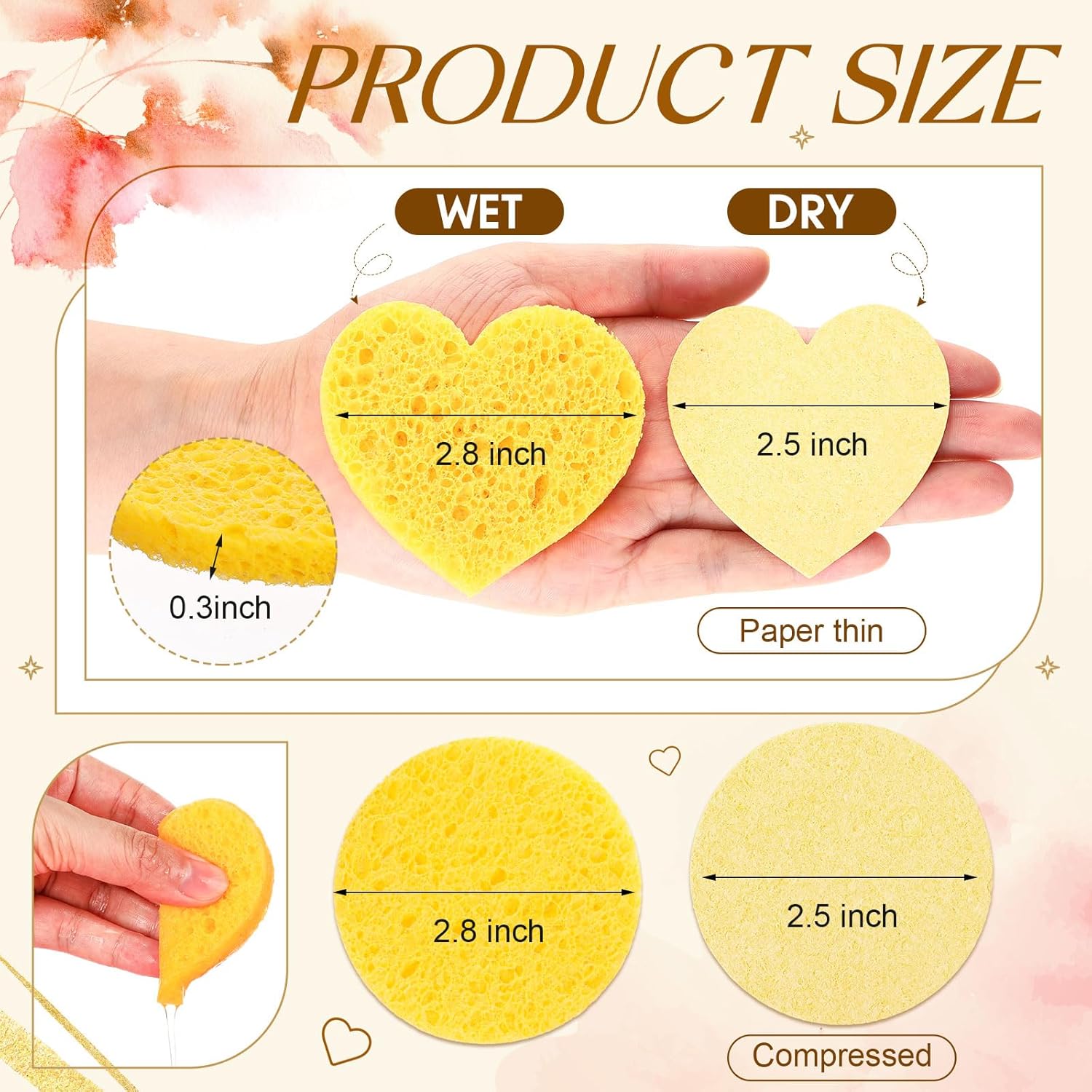 - Proper Size to Use: each facial sponge for esthetician measures approx 2.5 inches/ 6.3 cm in width, and can become 0.3 inch/ 0.8 cm thick after absorbing water; Because these sponges are compressed, they take up very little space when traveling