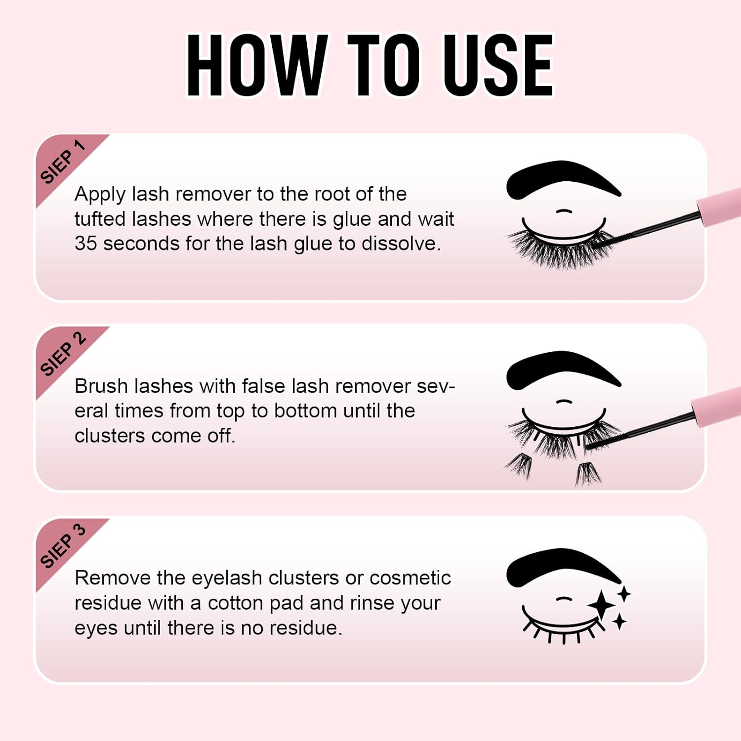 - How to Use: 1: Apply lash remover to the root of the tufted lashes where there is glue and wait 35 seconds for the lash glue to dissolve. 2: Brush lashes with false lash remover several times from top to bottom until the clusters come off. 3: Remove the eyelash clusters or cosmetic residue with a cotton pad and rinse your eyes until there is no residue.