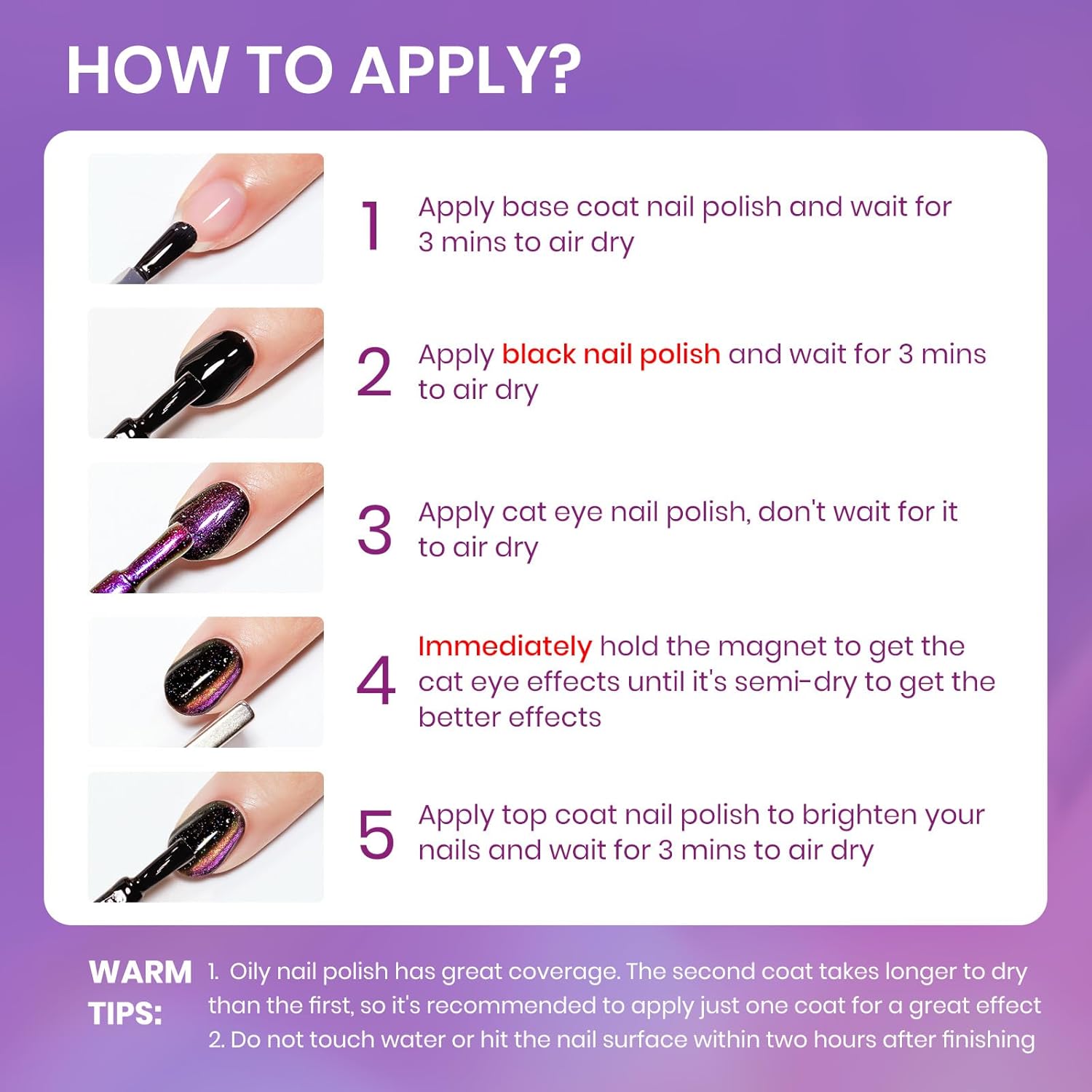- Important Tips: 1. When the nail polish is not dry yet, it will be fluid. Use magnets to hold it in place until it's semi-dry, then take them off for a sharp cat-eye look 2. Do not touch water or hit the nail surface within two hours after finishing to avoid peeling; 3. Base and top coat nail polish art necessary