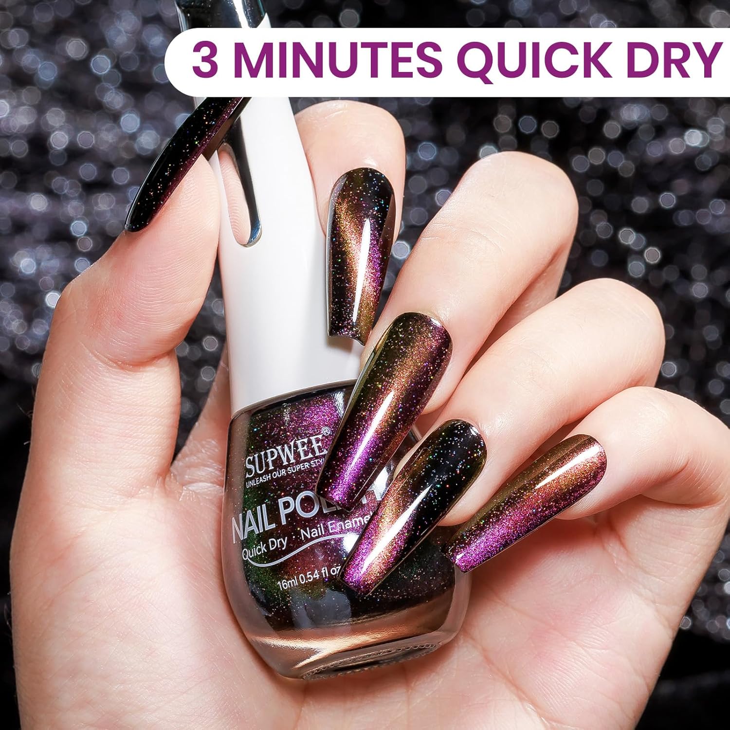 - Quick Dry Cat Eye Nail Polish: This magnetic nail polish set includes large capacity 16ml (0.54fl oz) shimmering black purple cat eye nail polish and 1 magnetic stick. The wide magnetic stick is perfect for creating a variety of charming cat eye patterns to add color to your manicure.
