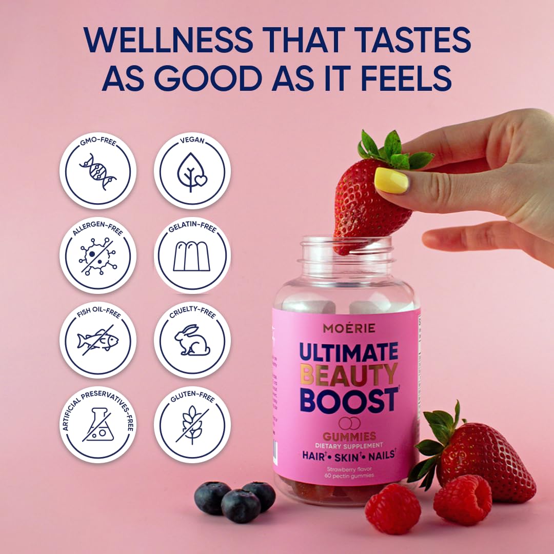- Wellness That Tastes as Good as It Feels! Upgrade Your Routine With Something You’ll Actually Enjoy — A Sweet Strawberry Biotin Gummies That Makes Beauty Support Fun Again. Packed With High-Potency Biotin, Vitamins C & E, and Clean Ingredients You Can Trust. Moerie Hair Nails and Skin Vitamins for Women and Men – Support Radiant Hair, Glowing Skin, and Strong Nails in the Most Delicious Way.