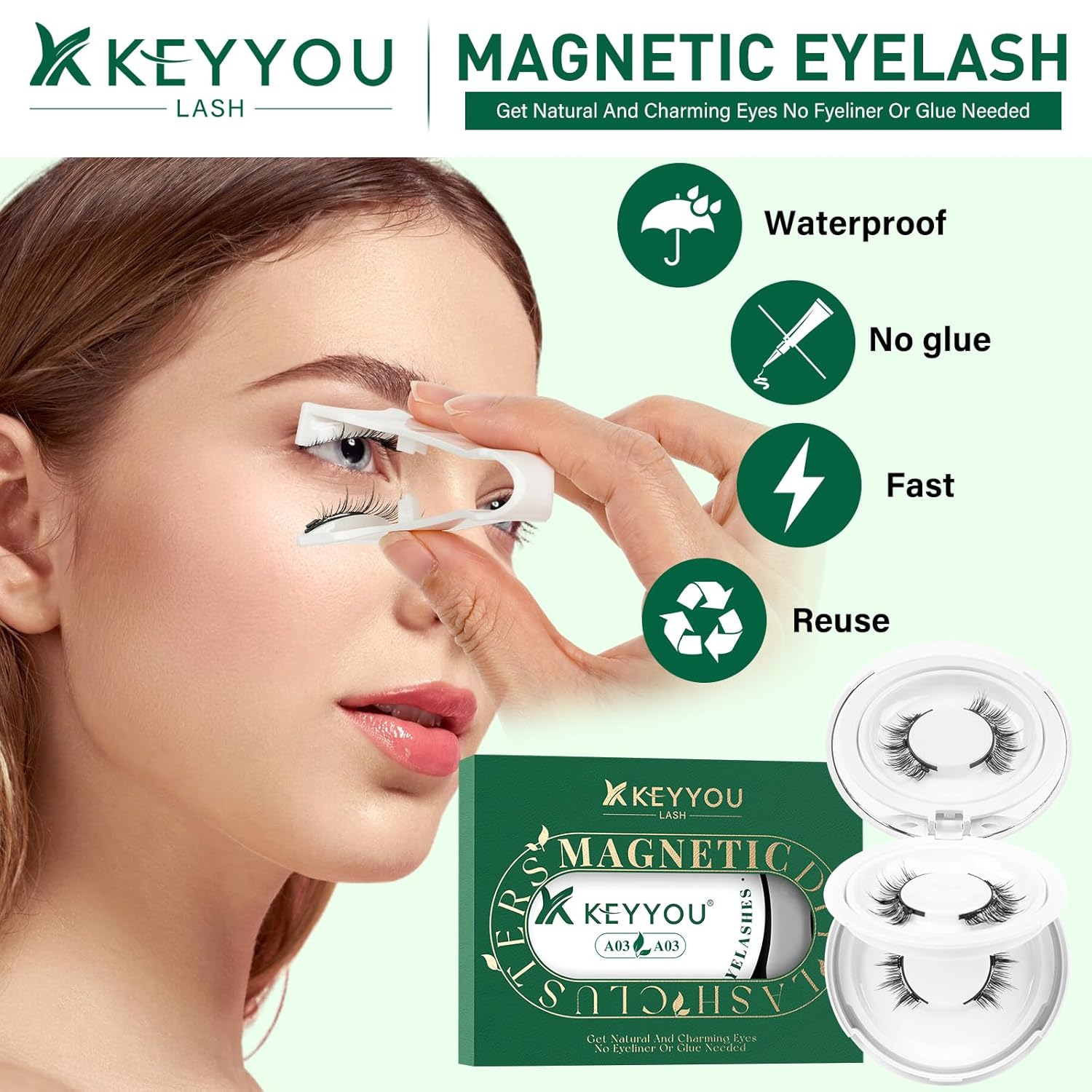 KEYYOU Reusable Magnetic Eyelashes 2 Pair with Applicator No Glue Needed 3D Natural Magnetic Lashes, Easy to Apply & Long Lasting for Daily Use & Events(A03+A03)