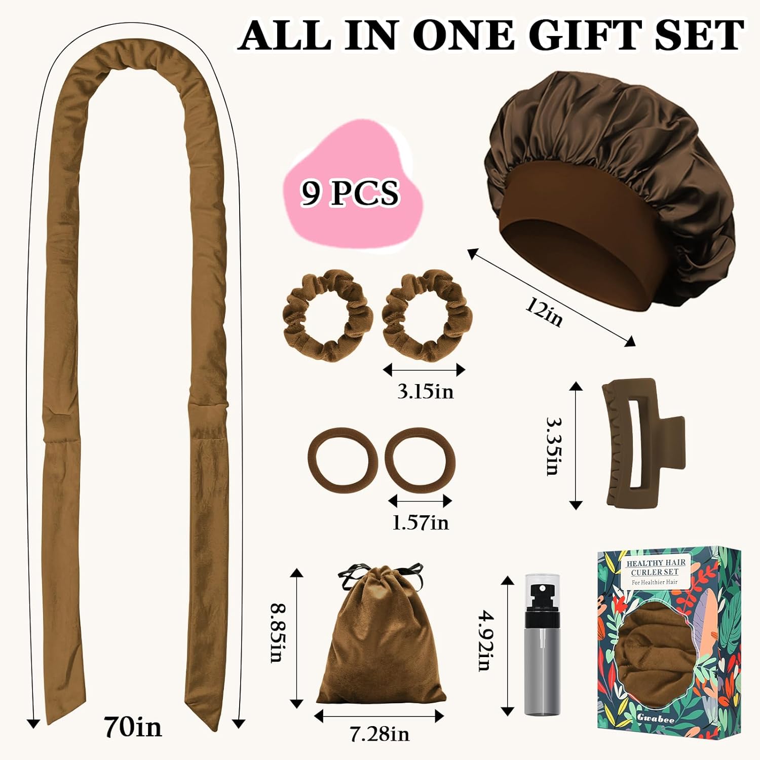 - WOMAN GIFT SET: Our hair curling set includes 9 items: 1 x 70-inch long velvet curling headband, 1 x satin hair bonnet for sleep, 1 x hair clip, 2 x velour hair ties, 2 x elastic hair ties, 1 x velour storage bag, and 1 x spray bottle. This all-in-one curling rods gift set is packaged in an exquisite box, making it the perfect gift for family, friends, and colleagues on various occasions, such as Christmas, New Year's Day, Birthdays, Mother's Day, Valentine's Day, and more