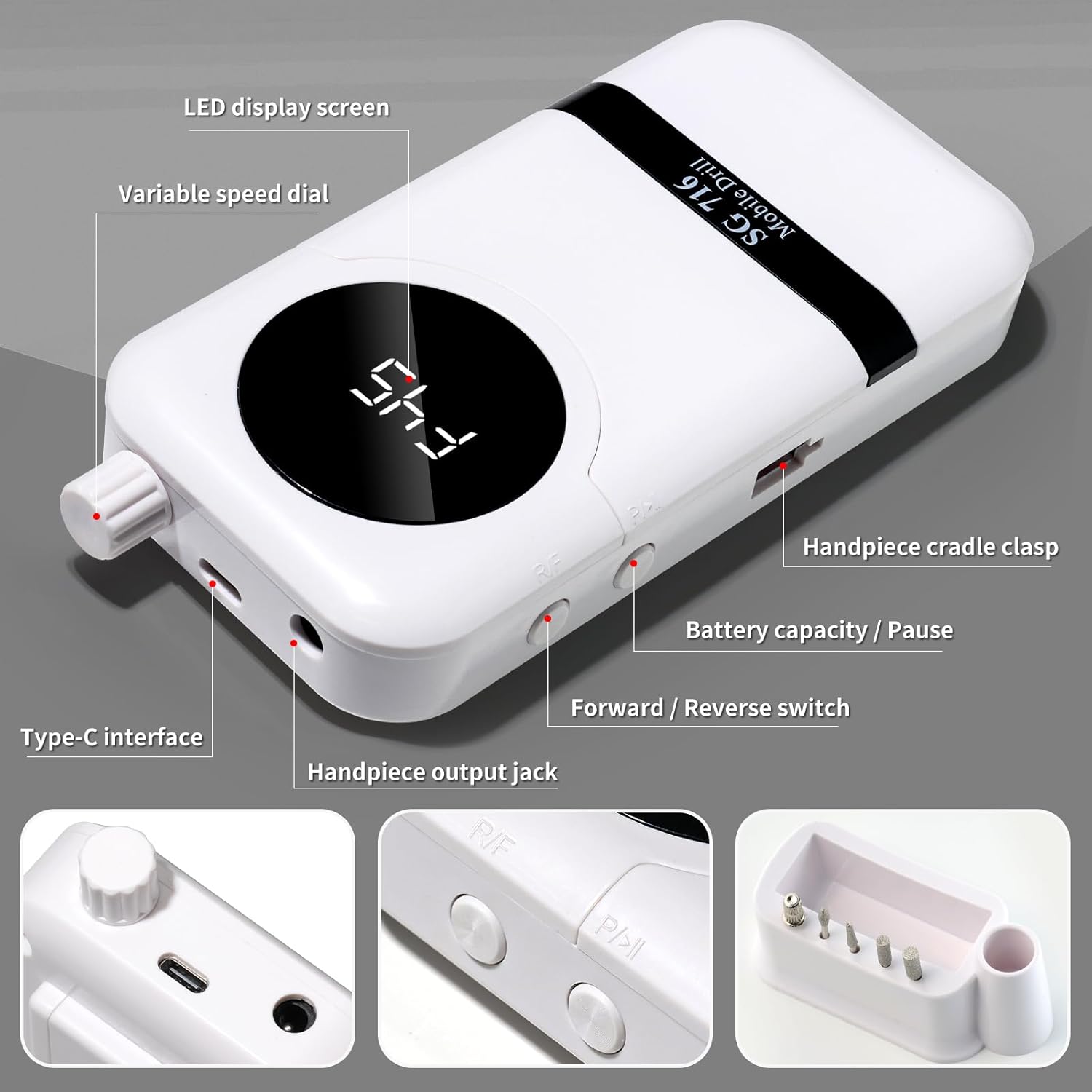 - 【Rechargeable Nail Drill】This portable nail drill built-in 2000mAh high-grade lithium-ion battery with just about 3 hours of charging,can be used for up to 8-10 hours.The smart LCD screen will display the rotational speed and battery remaining capacity,you can use it without worry when styling your nails.