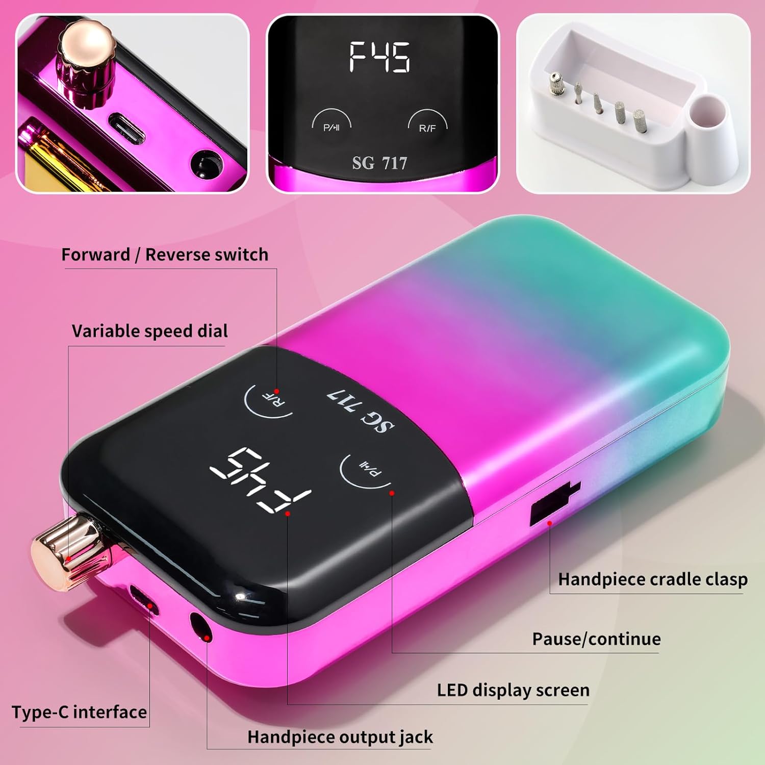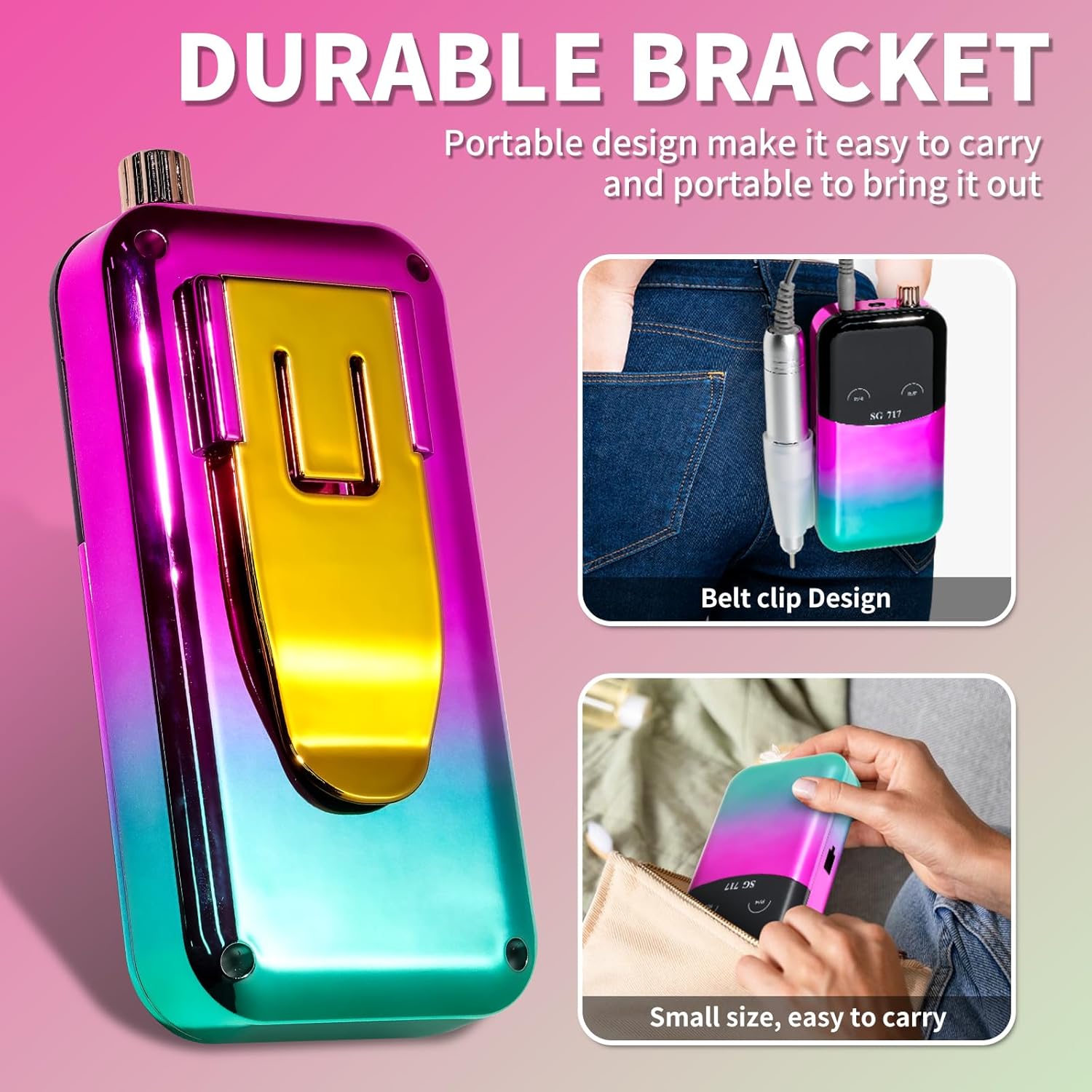 - 【Portable Nail Drill】This electric nail drill come with a portable Hanging clip design design make it Can be clipped around the waist of pants for use,compact to pack into your bag for carry and enjoy the nail art DIY anywhere anytime.Portable base design, when not using electric nail drill, can be placed on the base for upright and atmospheric display.