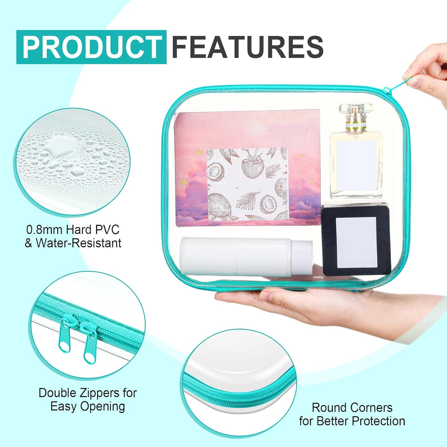 Sanwuta 6 Pcs Clear Hard Zipper Case Pencil Pouches Hard Plastic Zipper Pouches Makeup Bag Transparent Cases for Snacks Plastic Storage Organizer Box for Travel(Teal,9.84 x 7.87 x 2 Inch)