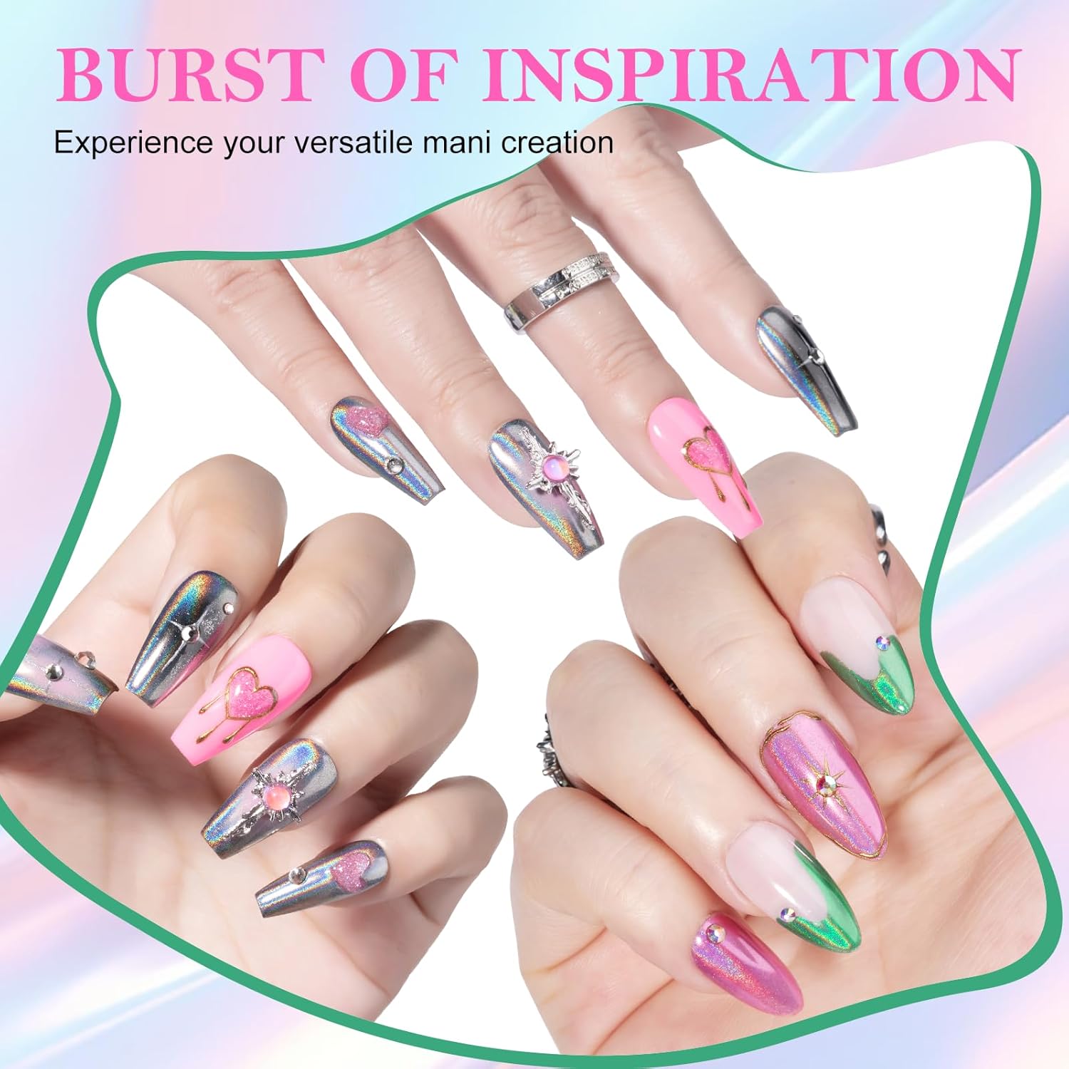 - Mirror Chrome Nail Powder: Make your nails shine like mirrors, moonlight and pearls. You can create different effects with gel nail polish of various colors to make your nails more delicate and textured. Just a little powder and your nails will look different