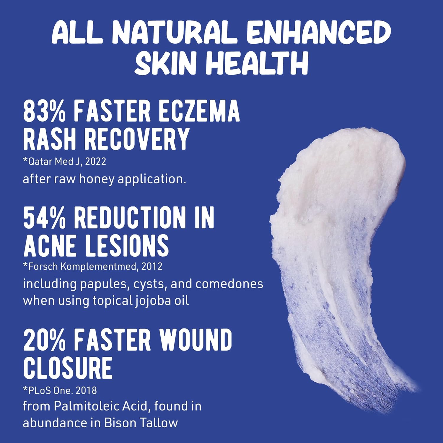 - CLEAN & SIMPLE INGREDIENTS: Made with grass-fed bison tallow, raw Manuka honey, organic jojoba oil, and a touch of rose geranium scent, this improved formula offers a nourishing solution for moisturizing your skin. It’s ideal for sensitive skin. Available in 2.5 ounce jars, each lasting up to 3 months with daily use, it provides gentle, non-greasy hydration for a soft, smooth feel.