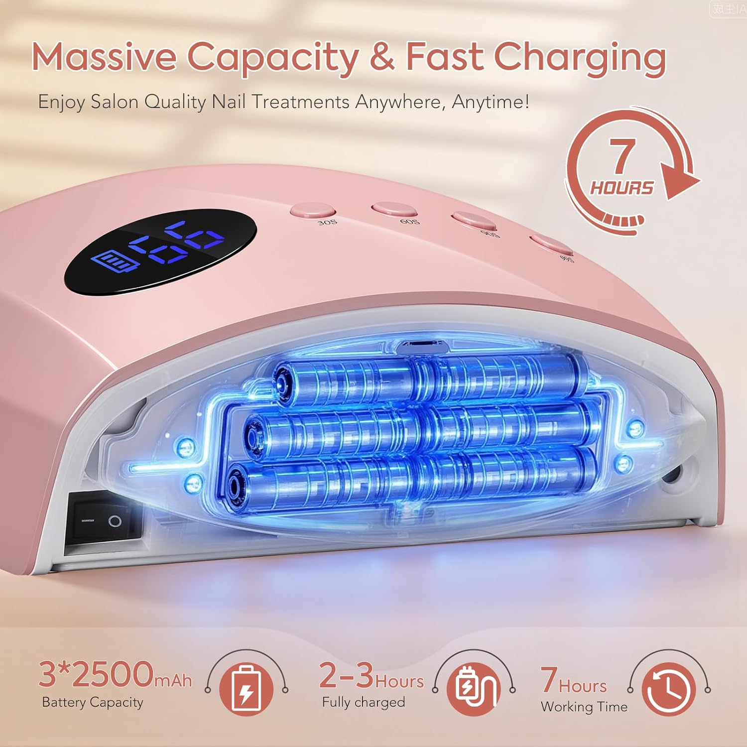 - Powerful & Gentle UV LED Nail Lamp - 45 dual-light beads (365nm+405nm) cure gel nails quickly while reducing eye and hand irritation. Built-in battery provides up to 7 hours of cordless use after a 3-hour charge, perfect for home or salon.