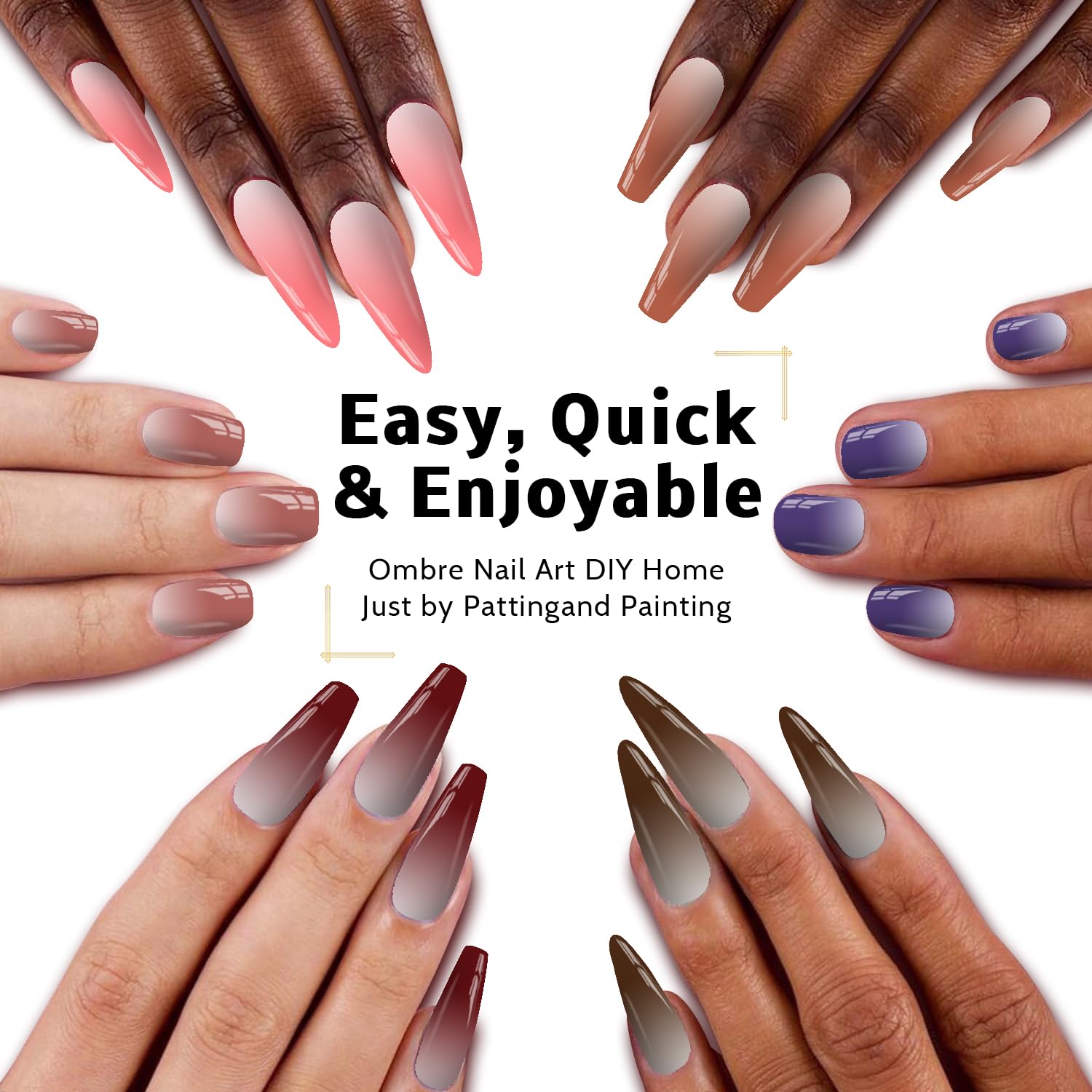 - ăHAVE FUN:ăKarroy ombre nail gel will bring you great fun by self-coloring mixing, sponge-patting painting, brushes drawing & dotting, ect. It's easy, colorful, and wonderful! Package list: 9-Color Palette, 6PCS Nail Art Brushes, 1 Grabber, 100PCS Nail Sponges.