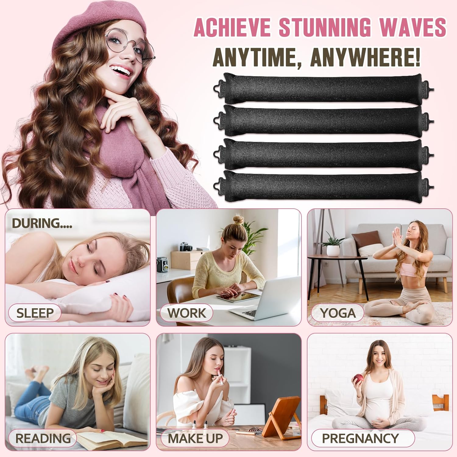 Heatless Curls Overnight, 4 Pcs No Heat Curling Blowout Rod, Satin Blowout Look Heatless Hair Rollers, Soft Flexi Rods for Big Curls to Sleep In
