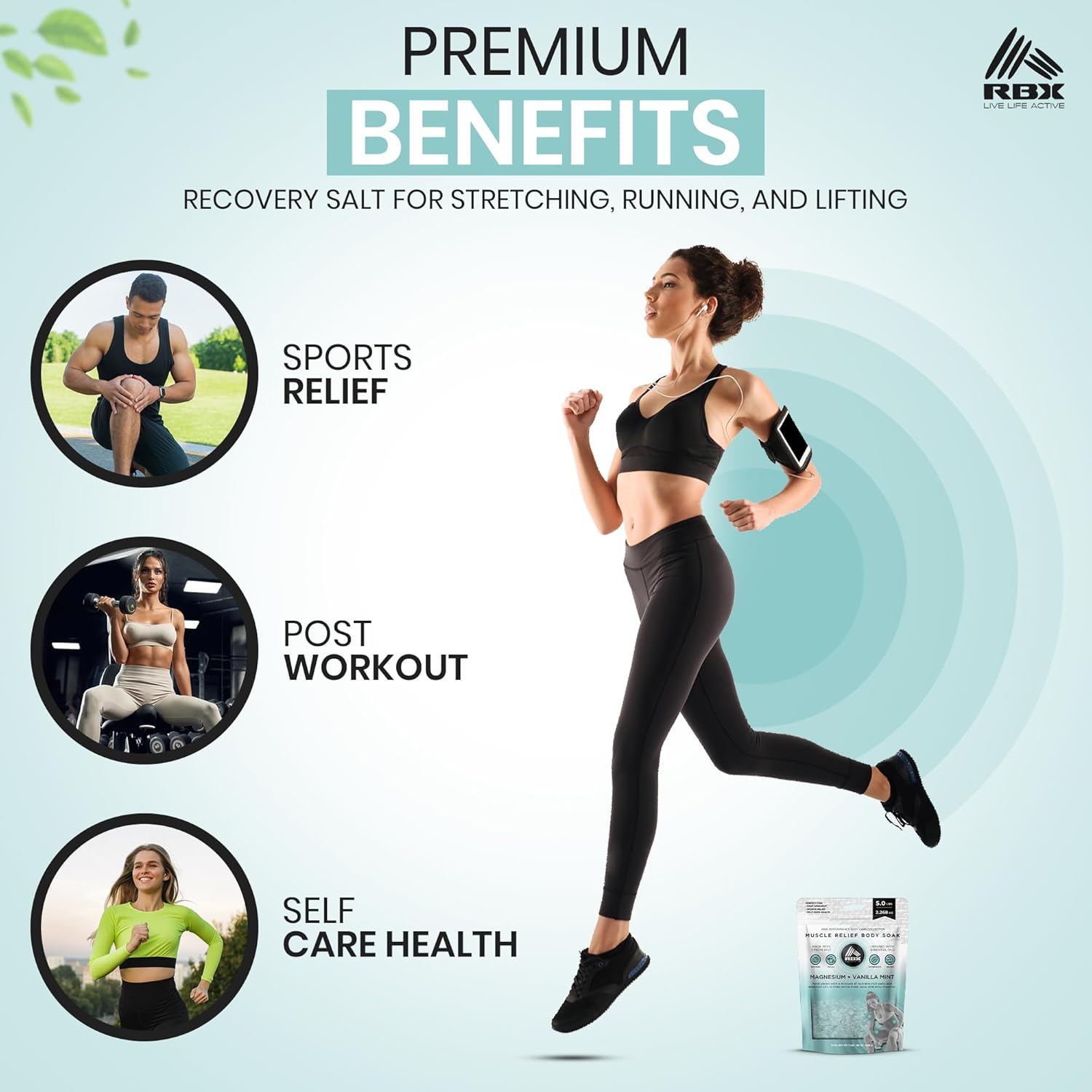 - POWERFUL MUSCLE RELIEF & RECOVERY - Soothe sore, tired muscles after workouts with RBX Muscle Relief Epsom Salt Bath Soak, enriched with magnesium flakes and premium bath salts. Perfect for easing pain, reducing tension, and supporting fast post-exercise recovery while enjoying a refreshing Vanilla Mint scent.