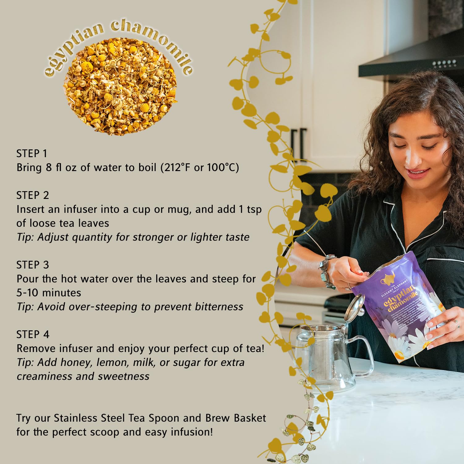 Egyptian Chamomile Tea, Organic Loose Leaf Herbal Tea – Cozy, Calming – Supports Stress Relief, Relaxation & Sleep – 4 oz Resealable Bag (Makes 50 Cups) – The Elegant Elephant