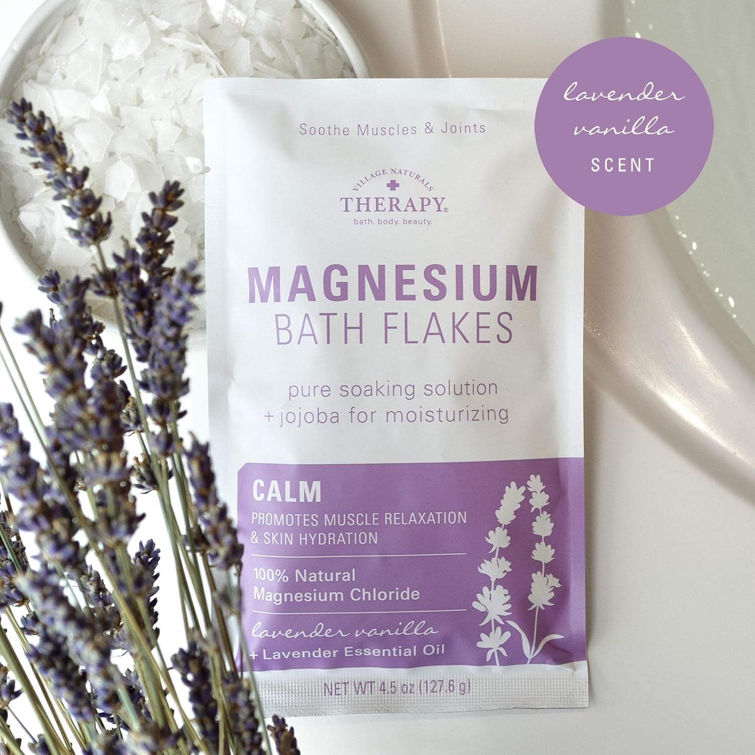 Village Naturals Therapy Calm Magnesium Bath Flakes, Lavender Vanilla Scent, 4.5 oz, Pack of 10